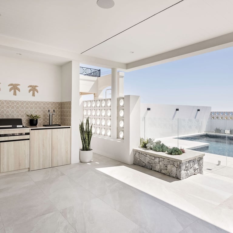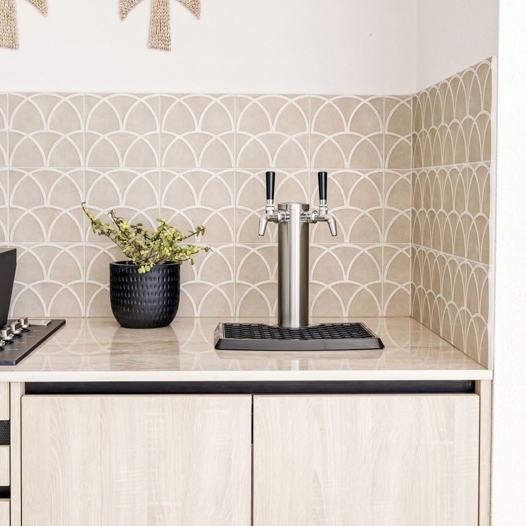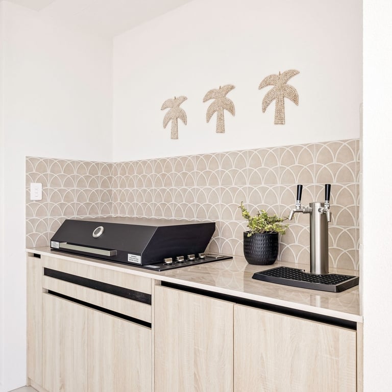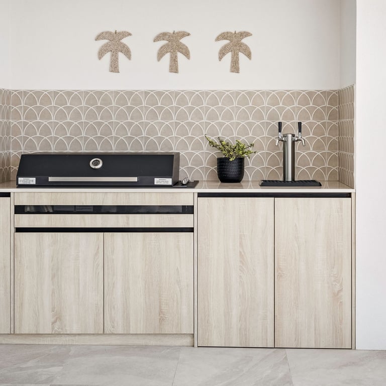 Transform your outdoor space with a custom BBQ area and your favourite beer on draught. Doors in Polytec stylex blonde oak.
