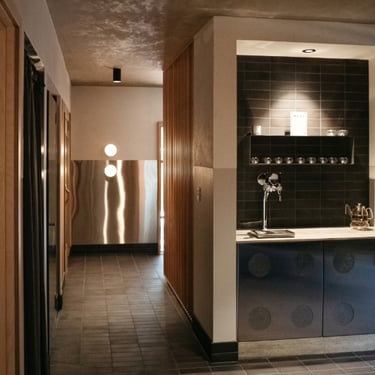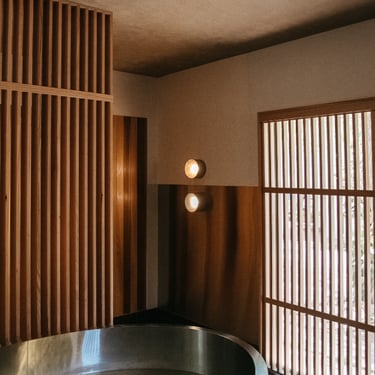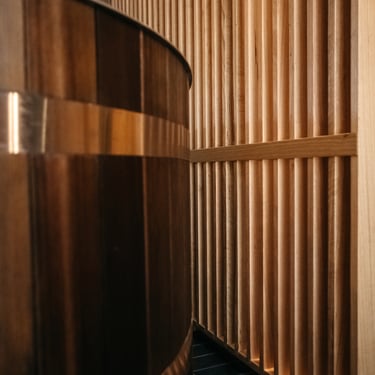 The project features custom Tasmanian Oak slatted window screens, curved door arches, custom Birch plywood doors, bench seating and vanities. All details are considered to create a space of humble luxury.