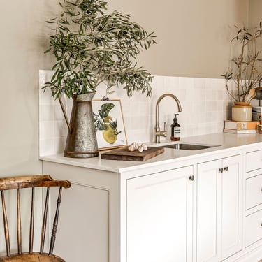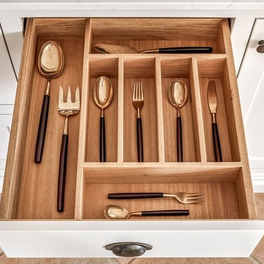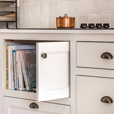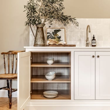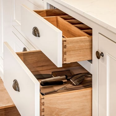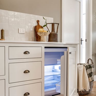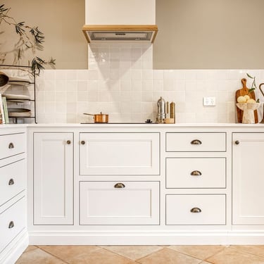 Custom built face frame, spray finished with three coats of 2pak. Hand made shaker style door fronts with 6mm bead detail and solid Blackbutt timber dovetail drawers with built-in cutlery inserts. Colour - Grand Piano by Dulux.